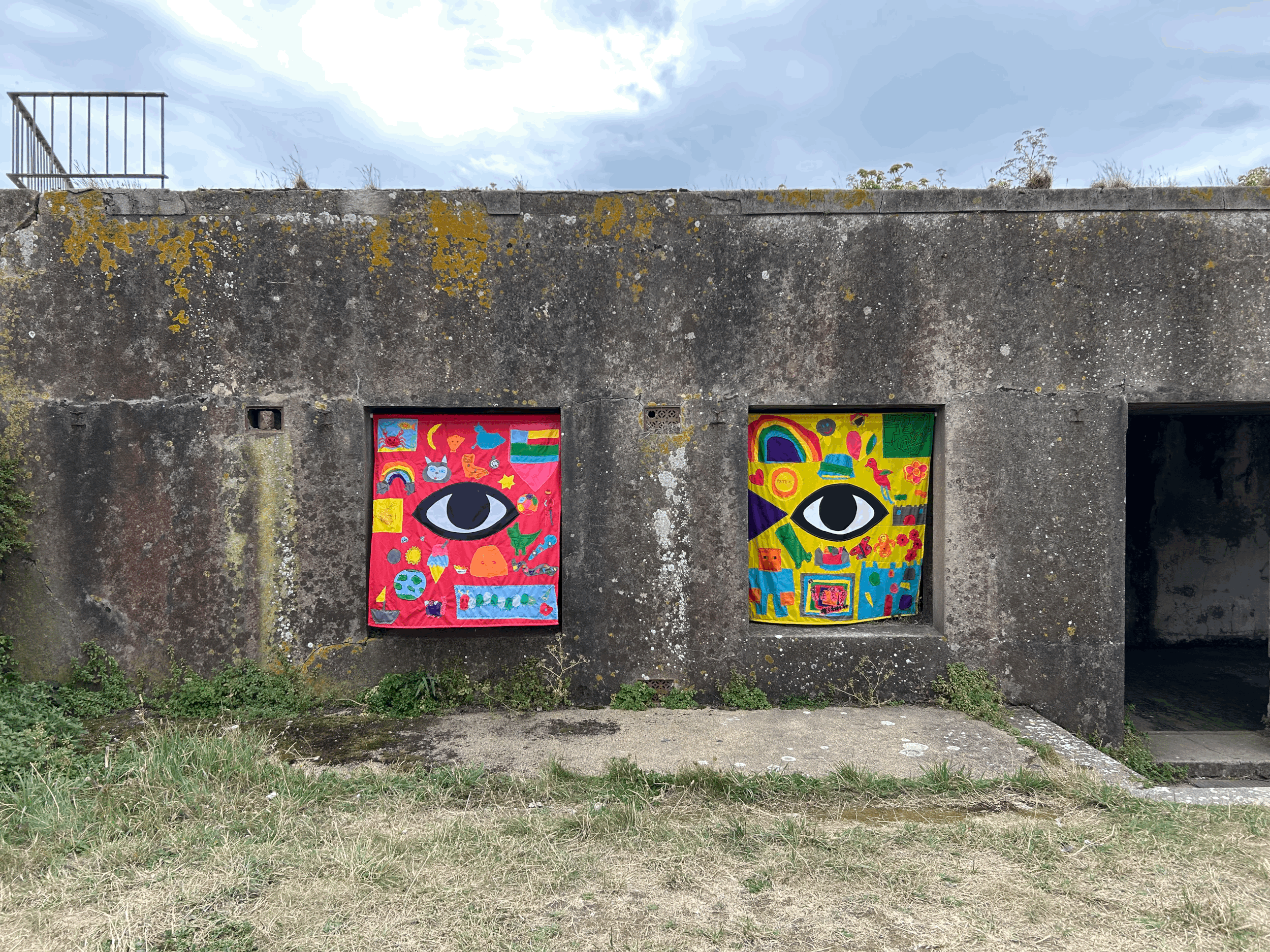 ‘Curtains for Sad Bunker Windows’ is now installed at Elizabeth Castle in Jersey, and two pairs of eyes are gazing out! The old curse is unravelling, and it all looks pretty amazing. We’ve cast a collective spell of LOVE!